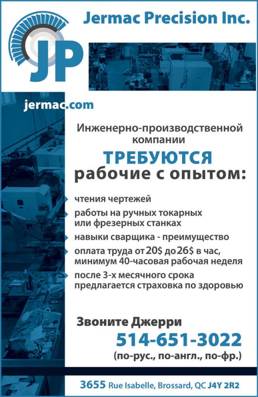 Инженерно-производственной компании Jermac Precision Inc. требуются рабочие с опытом: