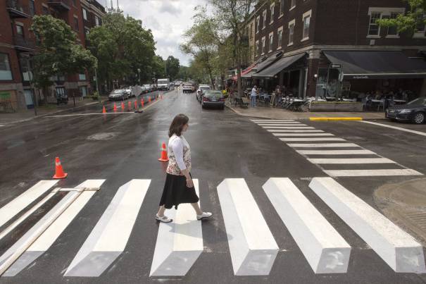 Один из райoнов Монреаля (каждый «боро» имеет право на самоуправление) принял решение использовать на переходах дорожную разметку, создающую иллюзию трехмерных предметов.