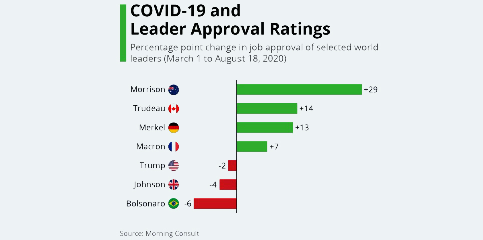 Самый большой скачок произошел у премьер-министра Австралии Скотта Моррисона — рост на 29 процентных пунктов с 33 до 62 за тот же период. Общественное мнение о Моррисоне было невысоким, после того, как он уехал в тайный отпуск на Гавайи, когда в Австралии в начале года бушевали пожары. Согласно The Conversation, одобрение Моррисона связано с его борьбой с пандемией.