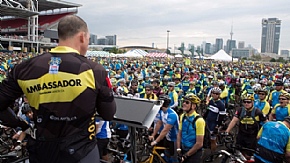 Перед тем, как отправиться в поездку длиной 200 км, велосипедисты собрались в Exhibition Place в Торонто. Те из них, кто боролся с раковым заболеванием и победил, прикрепили к своим велосипедам маленькие желтые флажки.