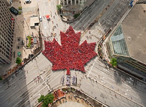 В центре Виннипега местные жители выстроились в гигантский кленовый лист и цифру 150 в честь дня рождения Канады. По официальным данным, во флешмобе приняли участие 3,600 человек в красных и белых футболках.