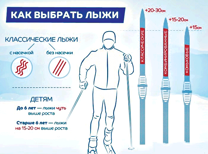 • лыжи комбинированные (оба вида) –на 15-20 см длиннее роста лыжника