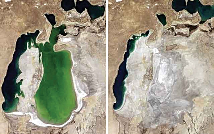 Конечно, это Аральское море. До начала обмеления — это 4-е по величине Озеро в мире, бывшее бессточное солёное озеро в Средней Азии, на границе Казахстана и Узбекистана. С 1960-х годов уровень моря (и объём воды в нём) стал снижаться, из-за забора воды из основных питающих рек Амударьи и Сырдарьи с целью орошения. Сегодня картина печальна: мы практически потеряли этот уникальный объект.