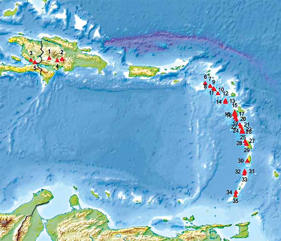 На этом фото представлена карта с существующими вулканами на Малых Антильских островах и острове Гаити. Их всего 35, многие из них уже спящие, но тем не менее оставившие след в истории формирования этого региона: