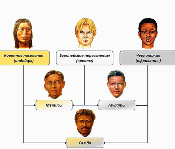 САМБО — индеец + негр (характерно также для Американского региона)