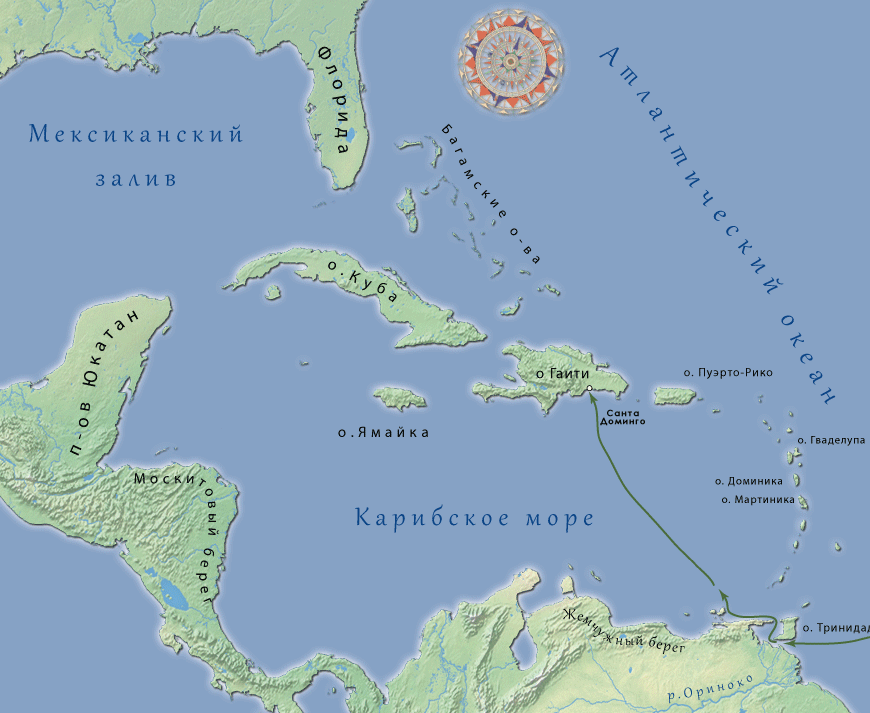 Река ГВАДАЛКВИВИР (территория Испании), 6 кораблей, около 300 человек экипажа (большинство из которых заключённые, их выпустили по просьбе Колумба из местных тюрем), отправление 30 мая 1498г. Колумб сознательно держит курс на юго-запад. Пересекая Атлантический океан, он надеется найти золотые богатства в южных районах Нового Света, ближе к экватору. Первой страной, которую открывает команда — о.Тринидад. Принимается решение обогнуть остров, двигаясь по часовой стрелке на юго-запад. Наносится на карту новый пролив БОКА-ДЕ-ЛА-СЬЕРПЕ (между современной Венесуэлой и о.Тринидад),а так же залив Пария и пролив БОКАС-ДЕЛЬ-ДРАГОН.