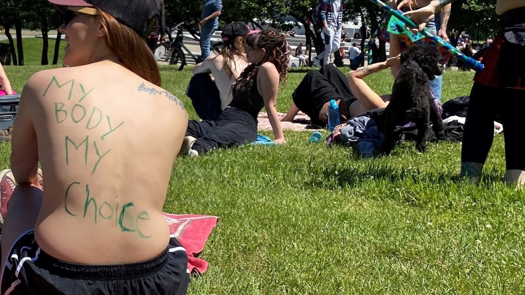 Десятки человек собрались топлес в парке Мон-Руаяль в полдень в воскресенье. Они пытались поддержать Элойзу Пуассон, которой полиция пыталась запретить загорать с голой грудью в конце мая.