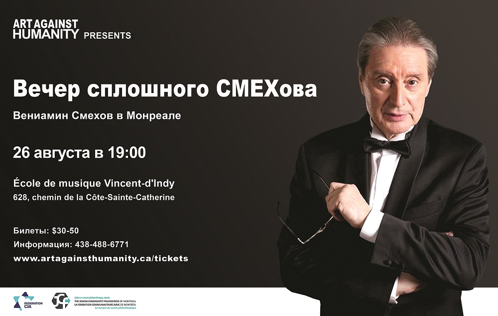 26 августа в 19:00 в Монреале выступит Вениамин Смехов с программой «Вечер сплошного СМЕХова». Воланд из легендарного спектакля Театра на Таганке “Мастер и Маргарита”, Атос из телефильма “Д’Артаньян и три мушкетера”, Илья Орлов в телеромане “Монтекристо”, автор мюзикла “Али-баба и сорок разбойников” представит монреальцам любимые стихи и литературные зарисовки. В программе: Владимир Маяковский, Игорь Северянин, Саша Черный, Николай Эрдман, Давид Самойлов, Александр Межиров, Иосиф Бродский, Владимир Высоцкий, рассказы и воспоминания. За дополнительной информацией обращайтесь по телефону: 438-488-6771 (Полина). Билеты от 35 долларов, пенсионерам и студентам скидки. Купить их можно ЗДЕСЬ. «Вечер сплошного СМЕХова» состоится по адресу École de musique Vincent-d’Indy, 628 Chemin de la Côte-Sainte-Catherine, Outremont, H2V 2C5.