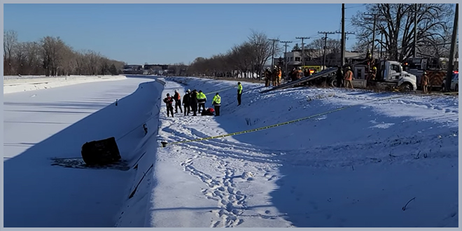 Пожарная служба Монреаля сообщила, что в понедельник результате столкновения двух автомобилей на улице Сен-Патрик в Ла-Сале внедорожник вылетел с дороги в канал и разбил лед.