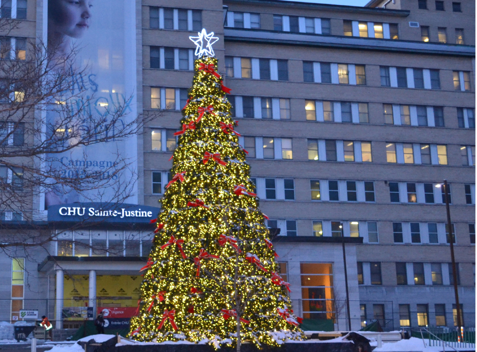 Вот уже десятый год перед госпиталем Sainte-Justine зажигаются огни на рождественской елке – этот проект, который стал возможным благодаря великодушию жителей Квебека. В этом году фонд научного медицинского Центра поставил перед собой цель зажечь для детей, которые встретят праздники в больнице, 150 000 огней и побить таким образом предыдущий рекорд. До 14 декабря эти огоньки можно приобрести по 5 долларов на сайте legrandsapin.org. Каждый день на ели будут появляться новые яркие огни, а выручка частично пойдет на научные исследования, а остальные средства будут переданы социальной службе госпиталя Sainte-Justine на поддержку семей, в которых есть больной ребенок. С 2008 года фонду удалось зажечь более 800 000 огней на праздничных елках перед госпиталем, что эквивалентно 4 миллионам долларов.